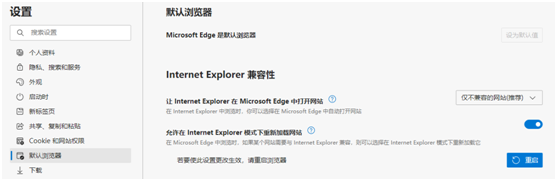 2. 在设置界面中,选择 “默认浏览器”选项,将“允许在Internet Explorer模式下重新加载网站”功能打开,按照提示点击重启按钮重启浏览器。