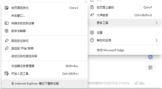 3. 再次打开需要兼容显示的页面,点击右上角的“…”,然后选择“更多工具”选项中的“在Internet Explorer模式下重新加载”,页面自动重新加载。