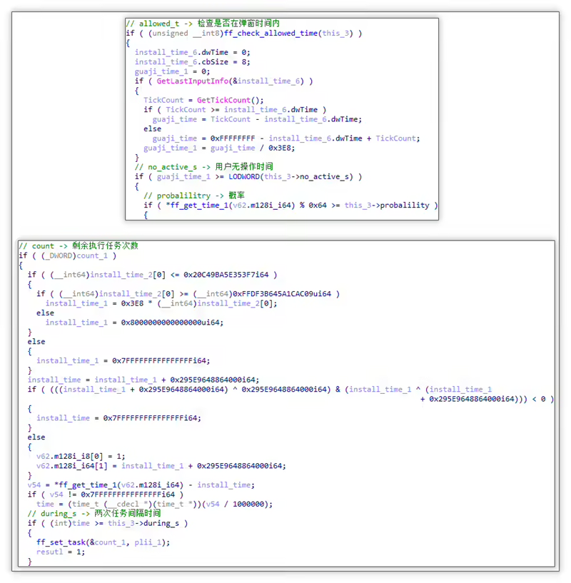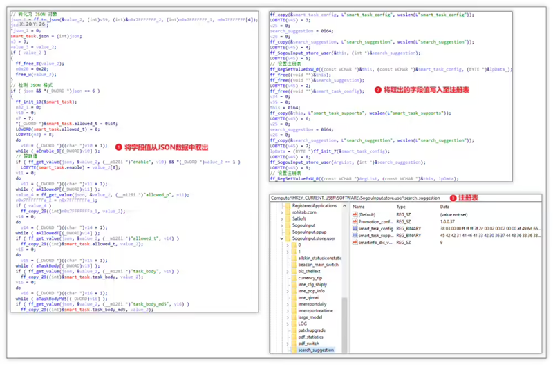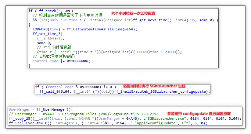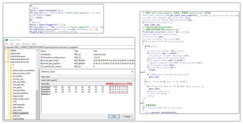 IT之家 9 月 20 日消息,火绒安全公众号今日发文称,火绒威胁情报中心近期监测到一款专门锁定浏览器主页的病毒正加速蔓延。经溯源,该病毒的源头指向搜狗输入法。 IT之家注意到,文章称搜狗输入法通过其 Shiply 终端基础发布通用模块,向云端请求控制配置。在下发这些云控配置中,会结合用户画像:例如所在地区、时间等诸多维度进行精准推送。由于 Shiply 平台本身具备灰度发布能力,据此推测,攻击者很可能先通过小范围灰度测试验证效果,再进行大规模传播。 文章称,该病毒的推广模块会首先检测用户设备上的杀毒软件,随后通过篡改配置文件的方式,强制修改 Edge 与 Chrome 两款主流浏览器的主页及默认搜索引擎设置。目前,火绒安全产品可对上述推广模块进行拦截与查杀。 1、样本分析 本文提及的搜狗输入法版本为 15.7.0.2192。 1.1、云控配置获取与推广模块下载 配置拉取源头:搜狗输入法将会借助 SGBizLauncher.exe 程序附加参数 -lappid=configupdate 进行拉取云控配置,该 SGBizLauncher.exe 程序会被输入法组件 SogouPY.ime 执行,执行间隔为六个小时一次。此输入法组件为 DLL 文件,将会通过用户切换至搜狗输入法时被加载。 ▲ 六个小时间隔配置拉取 设置 Shiply SDK 参数: 在 SGBizLauncher.exe 程序中,将通过 Shiply SDK 拉取配置。在此之前,需设置 APPID、APPKEY、BundleID、应用版本等参数,测试后发现其中 APPID 与 APPKEY 为关键参数,其将会决定拉取的配置。 ▲ 设置 APPID、APPKEY 等参数 Shiply 发布平台设置云控配置:搜狗输入法会借助 Shiply 发布平台设置云控配置,此发布平台可以通过规定时间、地区、应用版本号等条件来进行精准下发云控配置,且具备灰度发布等放量策略,可先进行小范围测试。对此次事件进行评估,亦是由于灰度发布或精准下发所致,故而未涉及更多用户。 ▲ Shiply 平台中测试设置云控下发条件 平台云控配置与本地拉取后数据库对应关系:下图为 Shiply 平台所创建的云控配置,其中创建 smart_task_config_1 与 beacon_main_switch_1 配置键和相对应的配置值,在本地获取上述云控配置时,Shiply SDK 会将这些配置存储于指定的数据库文件中。 该数据库具体路径为: C:\ProgramData\SogouInput\SGBizConfig\{APPID_SYSTEMID___}.db,此数据库为 SQLite 数据库。 ▲ Shiply 平台测试云控配置与本地拉取后数据库对应关系 上图为分析测试场景下的云控配置与本地数据库对应关系图,下图为搜狗输入法真实用户场景下的云控配置对应的数据库图,其中 smart_task_config_1 所对应的 JSON 数据内包含推广模块下载地址。 ▲ 搜狗输入法真实下发的云控配置对应的数据库图 随后从云控配置(JSON 数据)中提取数据后,将数据存储至注册表 SOFTWARE\SogouInput.store.user\search_suggestion 项中的 smart_task_config 和 smart_task_supports 键。其中,前者为提取的配置,后者为经加密处理的 allowed_p 字段,此字段代表允许的进程,即执行该任务的进程必须与 allowed_p 字段的值相符。 ▲ 取出数据并将数据存储至注册表 ▲ 任务云控配置 此时搜狗输入法 IME 组件被加载至 explorer.exe 进程时,将会调用 ImeInquire 函数,随后便开始检查是否开启搜索候选与搜索推荐。若二者之中有一项处于开启状态,便会进入解析云控配置的逻辑流程。从中能够看出,相关按钮是针对搜索候选和推荐的,不应与修改浏览器主页存在关联。 ▲ 云控任务执行相关开关 搜狗输入法将读取 search_suggestion 注册表 smart_task_supports 的值,以获取支持的进程名列表,并与当前进程名进行比对。若匹配则会继续运行进程。 ▲ 匹配指定进程名列表 进入任务前判断阶段: 1.首先,读取 HKEY_CURRENT_USER\SOFTWARE\SystemTask 项中的 task__{allowed_p} 键。若该键存在,则读取其中的 let_{上次任务执行时间} 和 remain_{剩余任务执行次数},以供后续检测使用。 2.检查当前时间段是否在 allowed_t(允许执行任务时间段)内,根据云控配置(0-28800;43200-50400;75600-86400)所示,时间段分别为 21:00-次日 8:00、12:00-14:00,估测是规避工作时间,避免被技术人员复现该现象。 3.借助 GetLastInputInfo 函数检测用户无操作时间是否超过 no_active_s(无操作时间)的情况。 4.时间为随机数并除以 100 来获取余数,来判断该余数是否> probalility(概率)。 5.检测剩余执行任务次数是否>0。 6.检测当前时间与上次任务执行时间的间隔是否>during_s(任务执行间隔)。 7.最后将任务信息保存至注册表,并开始执行任务。 ▲ 任务前判断阶段 任务信息保存至注册表:首先会将云端配置中的七个关键参数以下划线的方式连接:task_body_md5、version、durings_s、cycle_c_s、count、probalility、no_active_s,对它们进行 MD5 哈希计算,得出 MD5 值。随后再将 allowed_p、MD5 值、let_{当前时间}、during_{durings}、remain_{剩余任务执行次数}(该值每次任务执行时都减 1)通过分号连接,并将该字符串写入至注册表 HKEY_CURRENT_USER\SOFTWARE\SystemTask 项 task__{allowed_p} 键中。 ▲ 任务信息保存至注册表 下载推广模块:任务开始后首先解密 task_body64 字段值(该解密算法采用的是 AES 算法并搭配非标准密钥流),获取到下载链接:https://ime.gtimg.com/ pc / brspgchange20250811x64_a.dat 并开始下载,下载完毕后,运用 MD5 算法计算所得 MD5 值,并与 ▲ 下载并计算 MD5 值 解密推广模块:下载到的 brspgchange20250811x64_a.dat 文件经过加密处理,其解密需运用云控配置中的 key(98c0b113a40fe1790d9e116d75dcfcff)与字符串 "secret" 异或出新的 key,随后以该新的